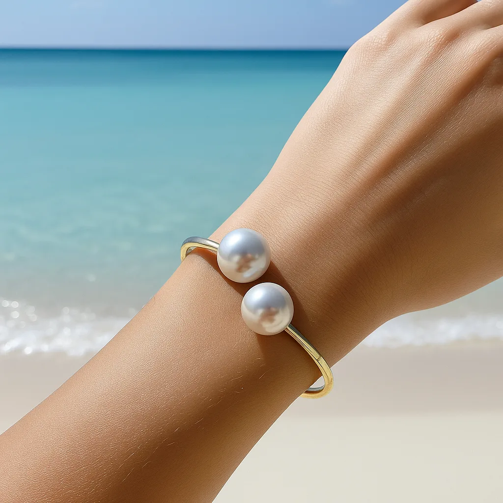 Elegant Pearl Open Cuff Bracelet by Zivaara — a premium gold-plated women’s bracelet featuring dual pearls, minimal design, and timeless elegance. Perfect for daily wear, gifting, weddings, and beach-inspired fashion.