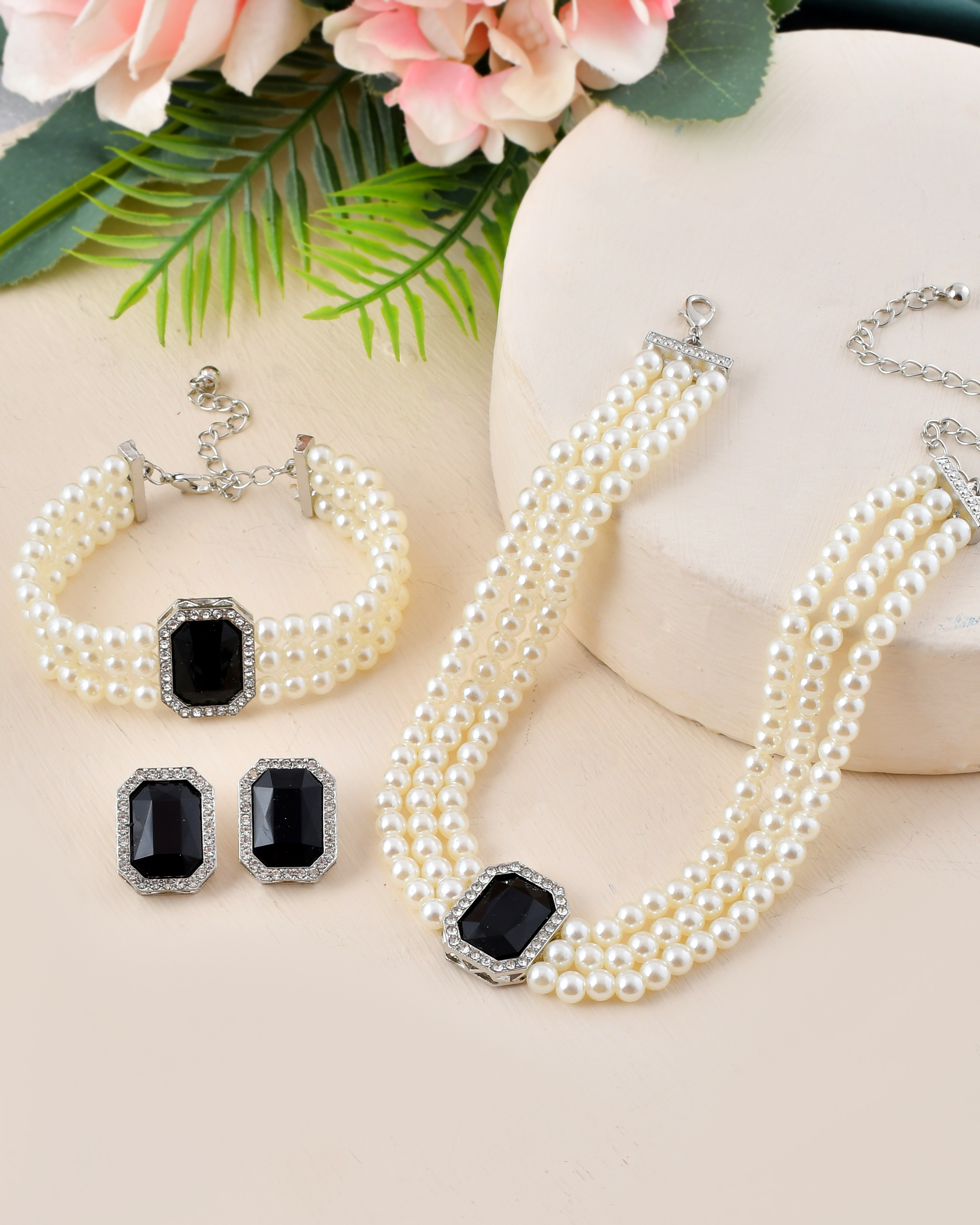Black Stone Jewelry Set featuring a pearl necklace, matching bracelet, and earrings. Traditional and luxurious, this set is perfect for weddings, festive occasions, and parties. Order your Black Stone Jewelry Set today to elevate your ethnic style.