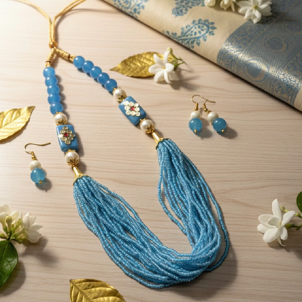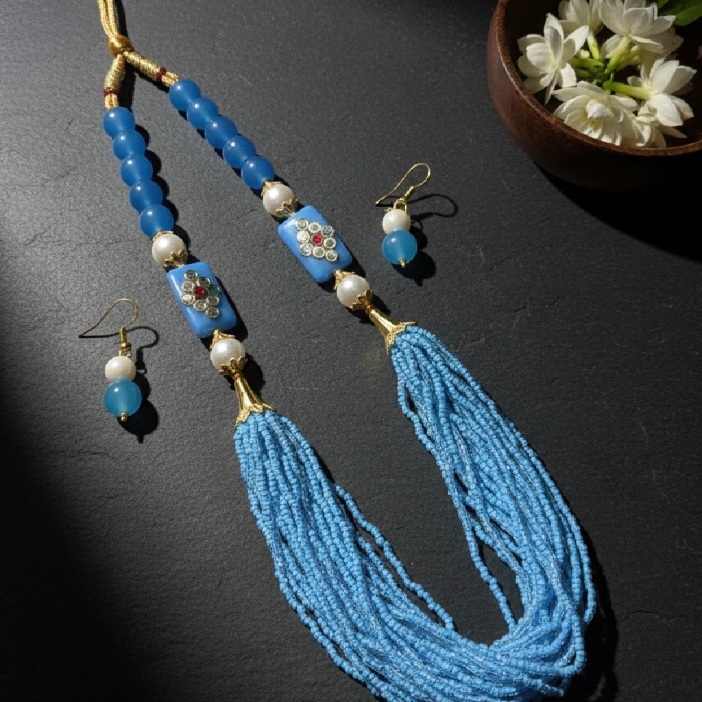 The Artificial Sky Blue Stone Kundan Necklace Set for Weddings & Festive Wear is a beautifully crafted traditional jewellery piece designed to enhance your ethnic and festive look. This elegant necklace set features sky blue stone beads paired with pearl accents and premium kundan detailing, finished with graceful sky-blue tassels that create a fresh, royal, and luxurious appeal.