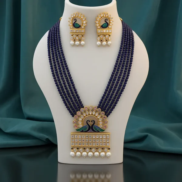 - Rich Blue Beaded Strands: Features **five layers of deep blue beads** that drape elegantly, forming a luxurious **Beaded Rani Haar** style.